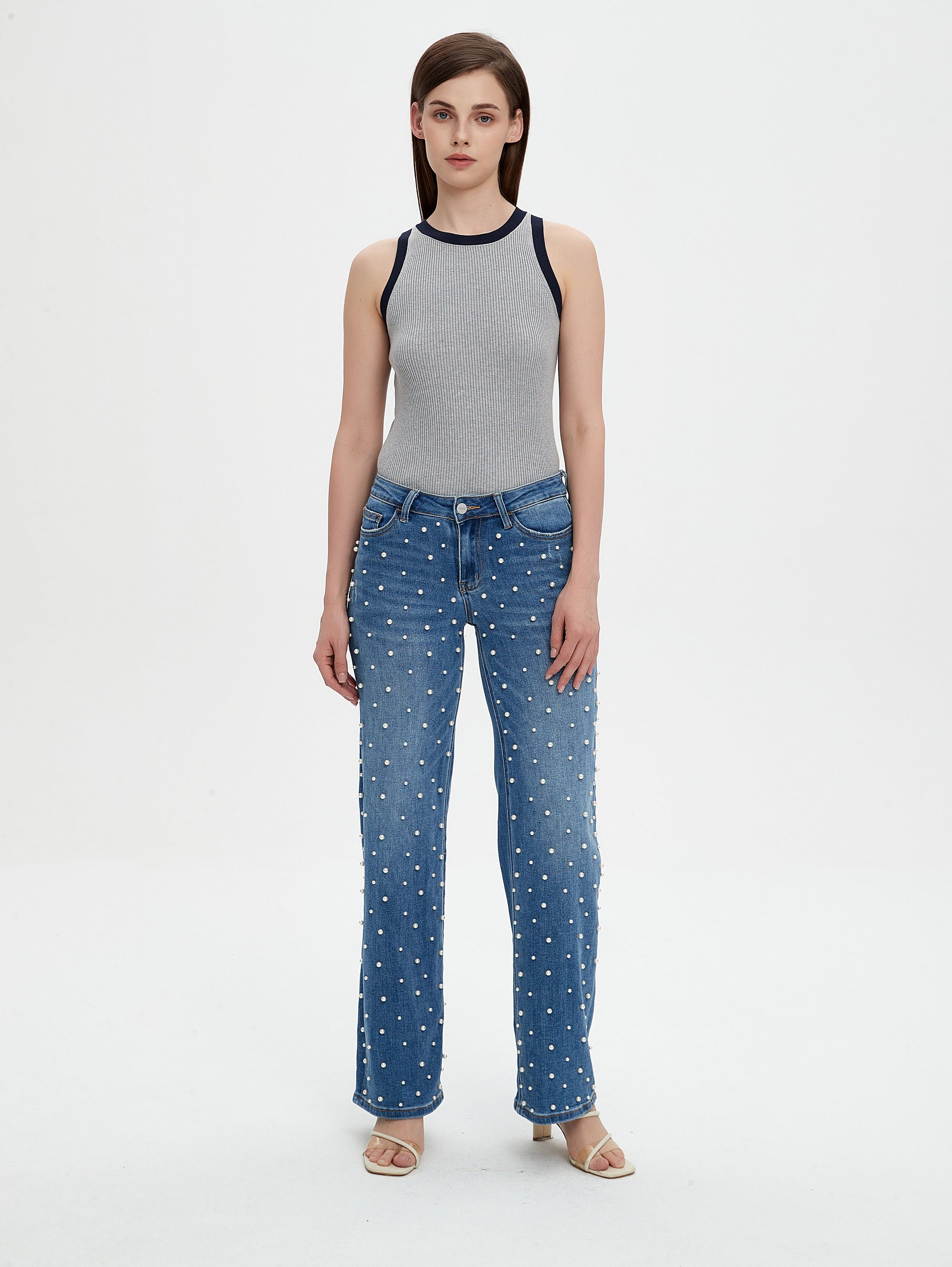 ONESO Women BBL Jeans Mid-Low Rise Wide Leg Stretch Relaxed Fit Embroidered Jeans Flat Tummy Design Simple Basic Trousers