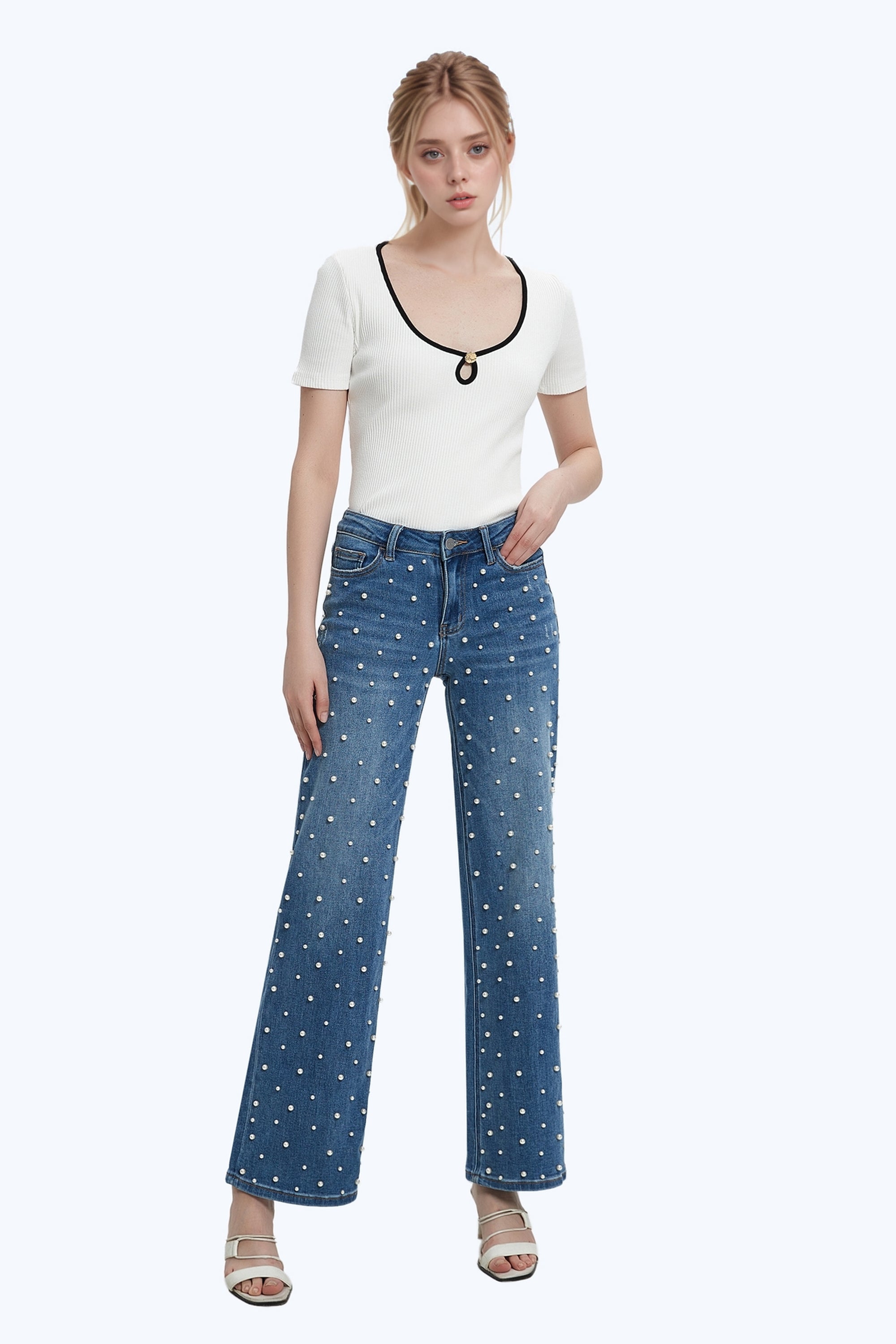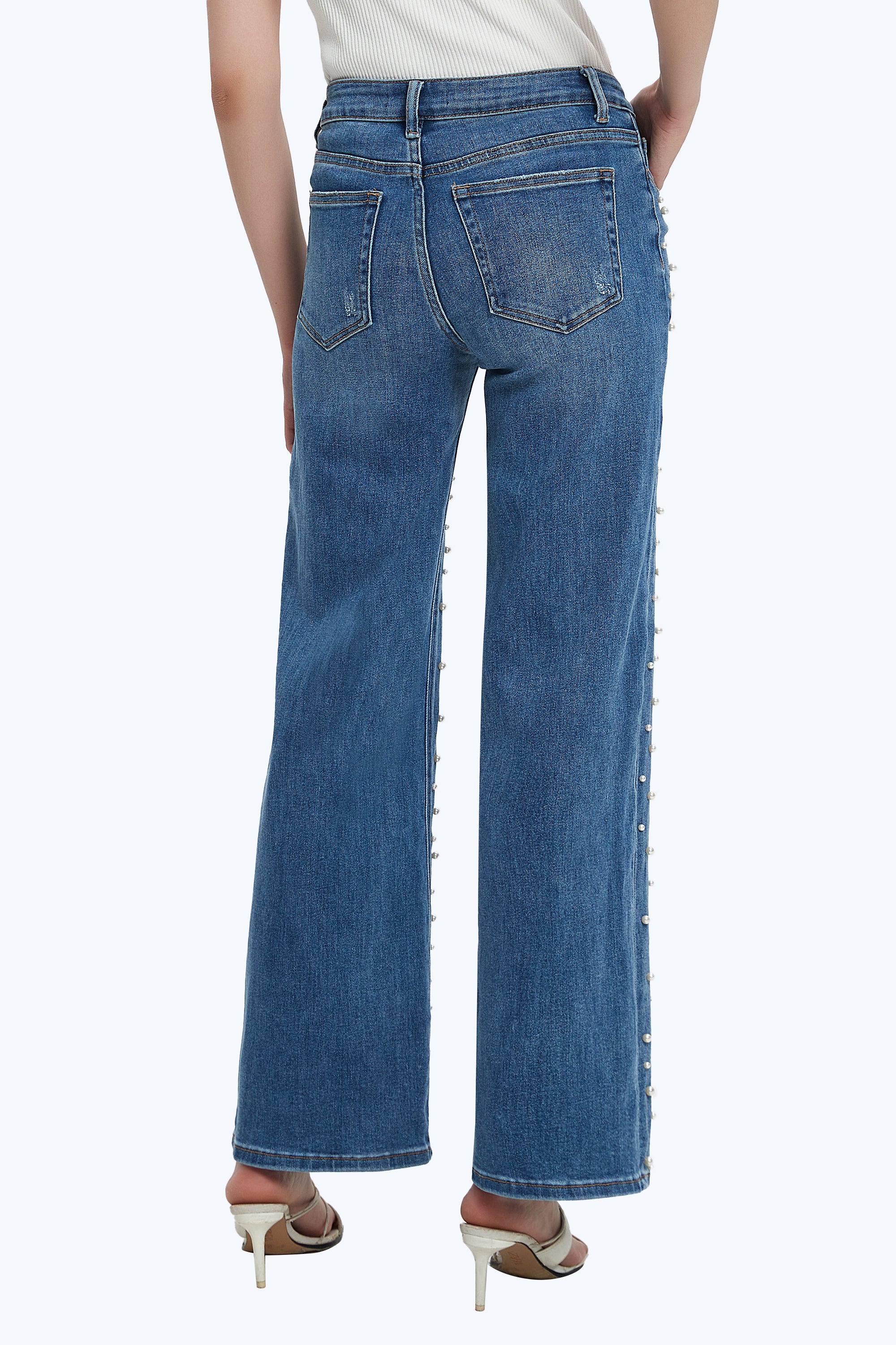 ONESO Women BBL Jeans Mid-Low Rise Wide Leg Stretch Relaxed Fit Embroidered Jeans